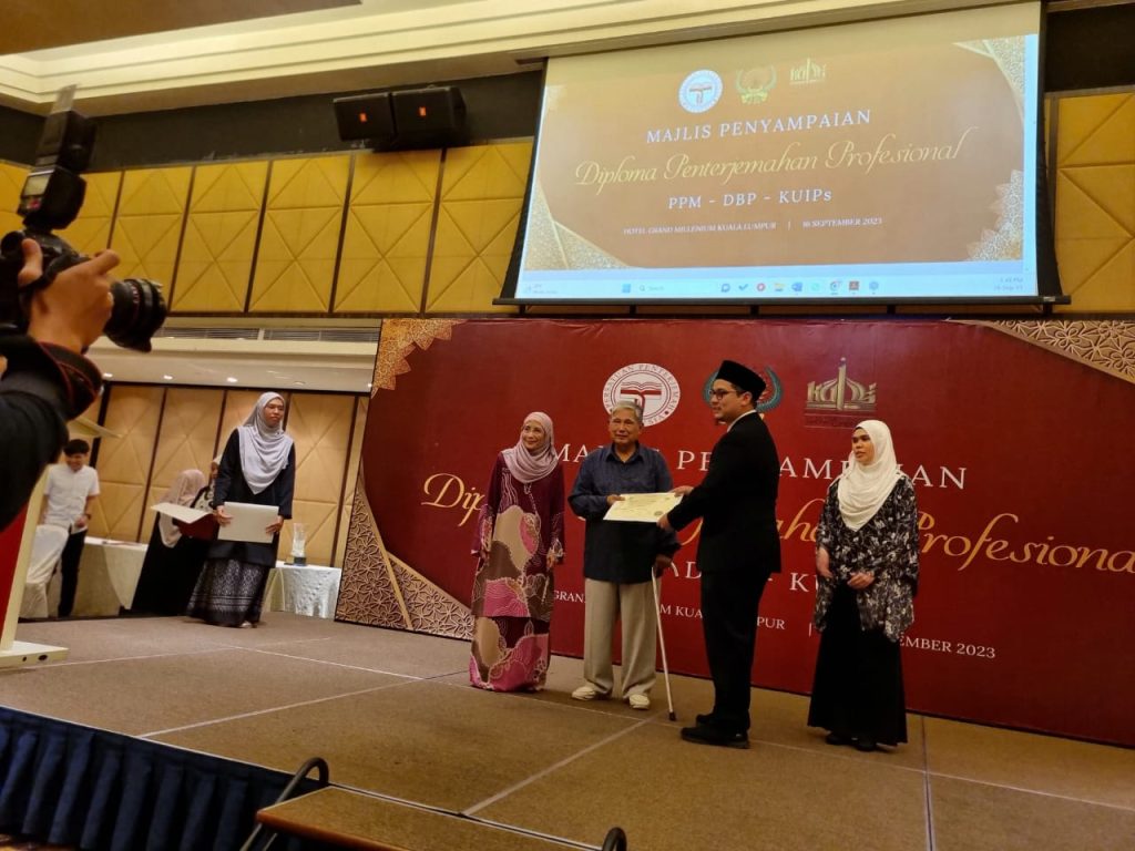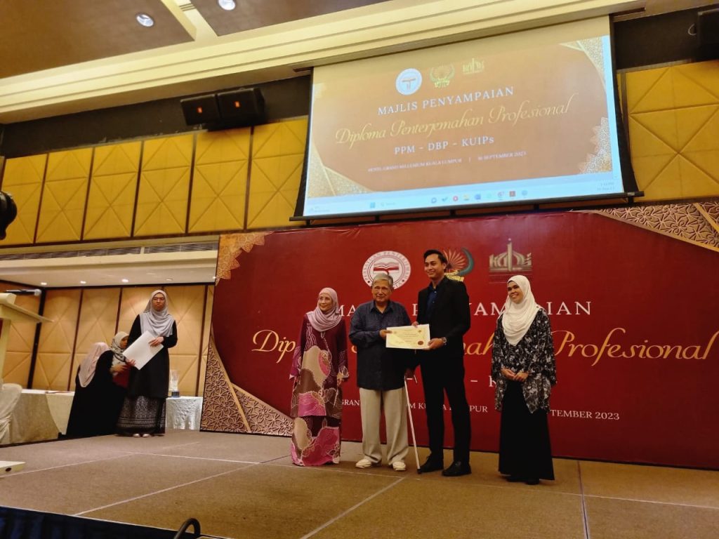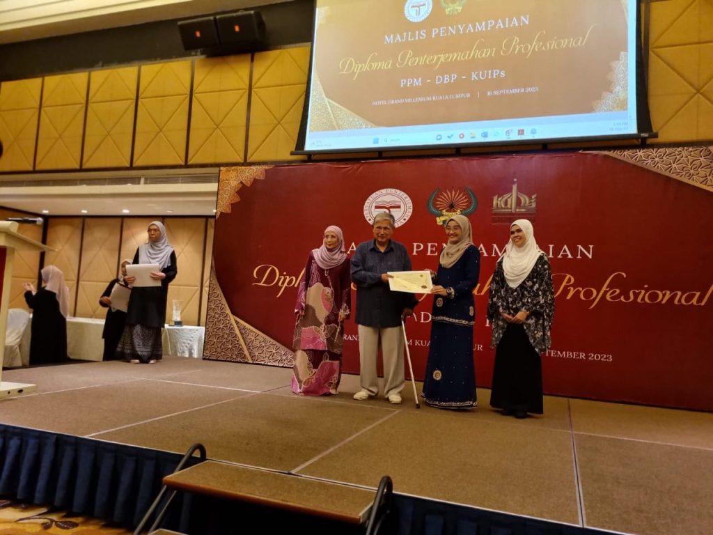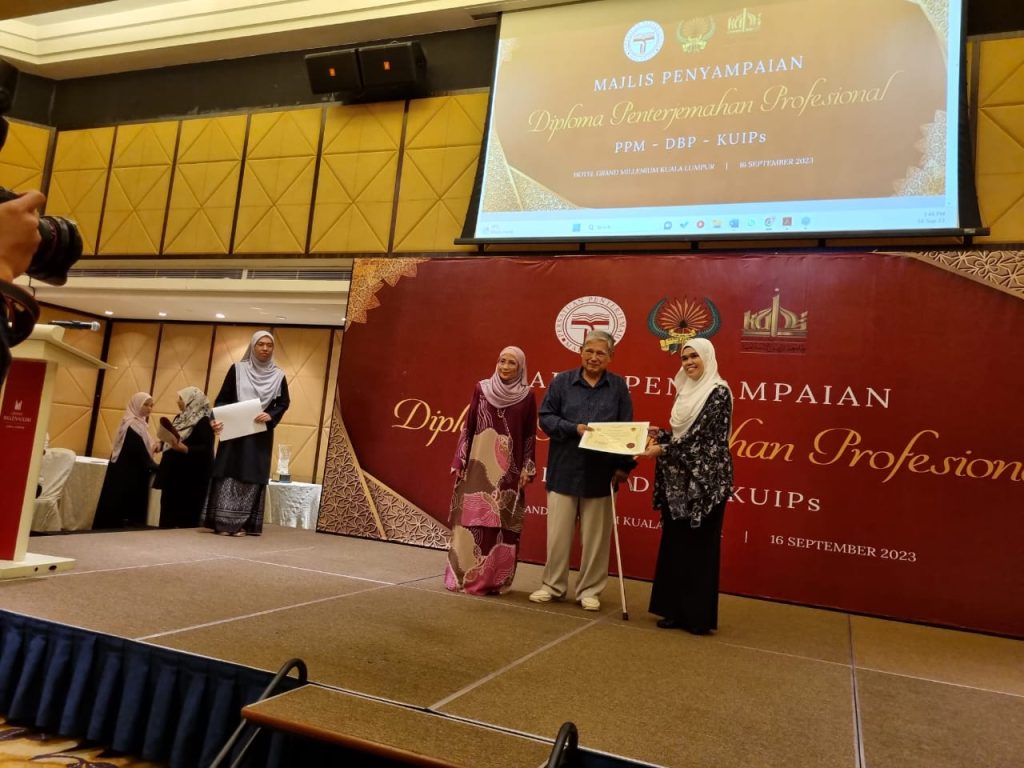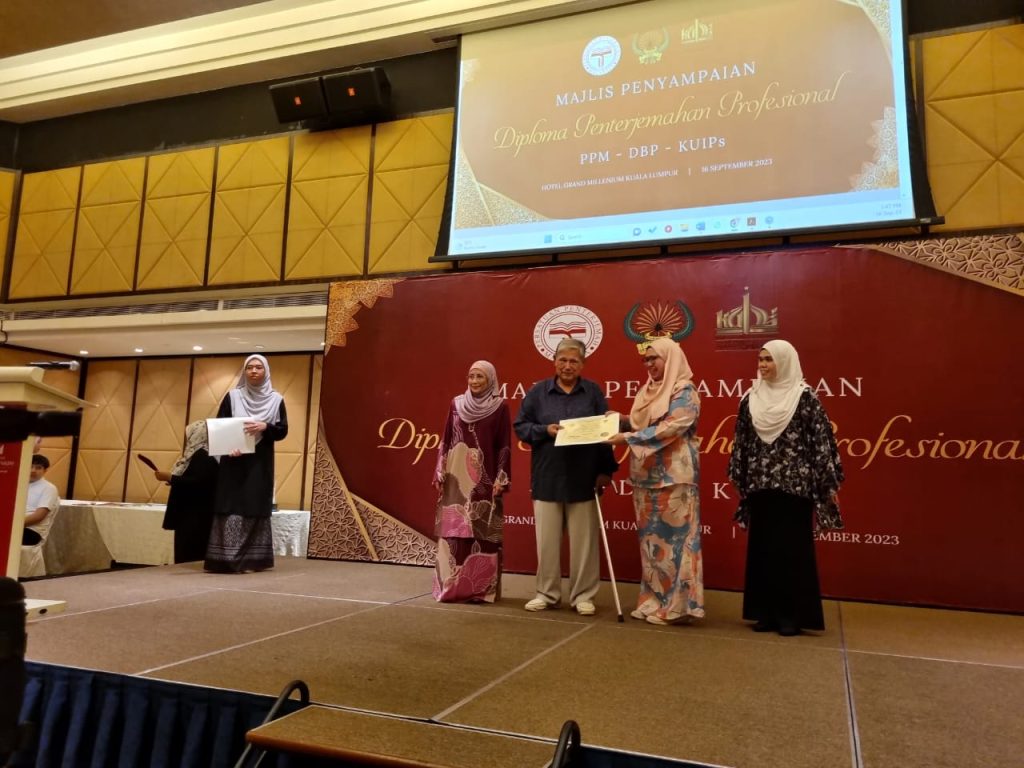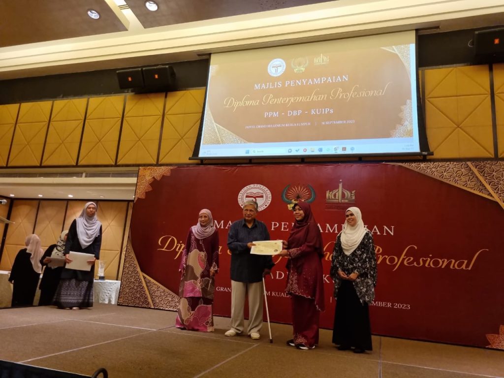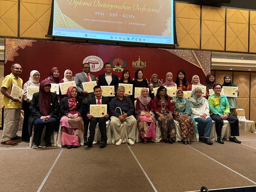 Majlis Penyampaian Diploma Penterjemahan Profesional PPM-DBP-KUIPs bagi Sesi KM 2/2022 dan Sesi Khas KUIPs 5/2022 telah berlangsung pada 16 September 2023 di Hotel Grand Millennium Kuala Lumpur. Seramai 33 orang penerima diploma di samping pengiring, wakil KUIPs, wakil DBP, Ahli Majlis dan tenaga pengajar telah hadir. Yang Berbahagia Prof. Emeritus Abdullah Hassan, Presiden PPM telah menyampaikan diploma diiringi oleh Dr.Hasuria Che Omar, Naib Presiden PPM dan Pn. Anis Jazilah Azmin, Pengarah Pusat Bahasa KUIPs.