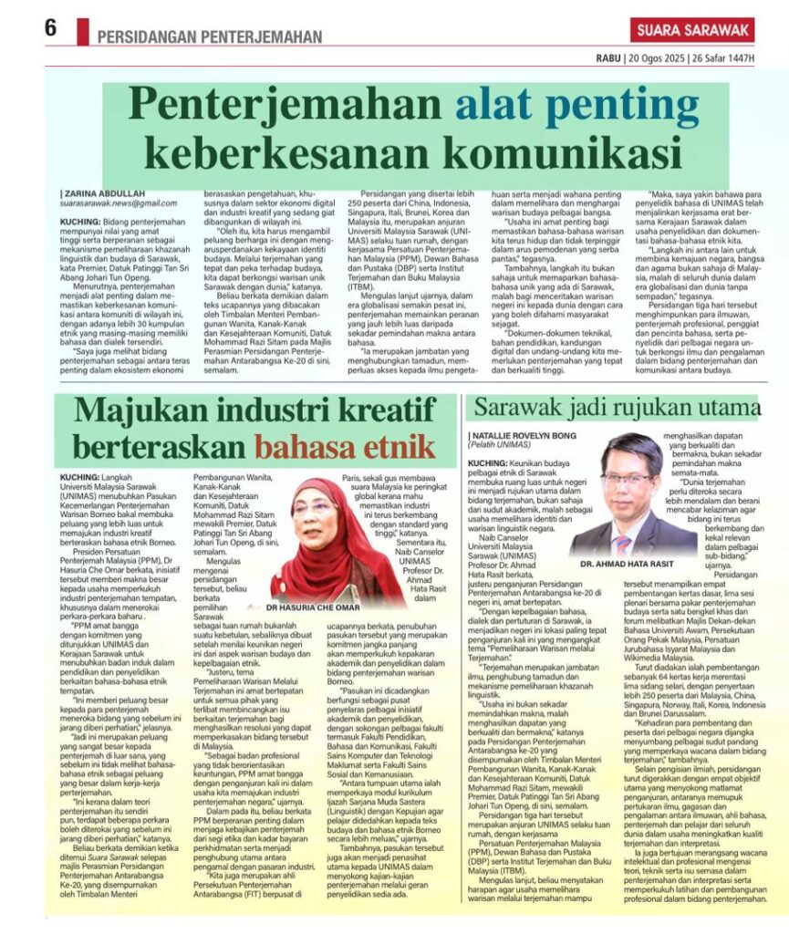 The plenary presenters consisted of Prof. Jorge Diaz-Cintaz (Professor at the Centre for Translation Studies, University College London, United Kingdom), Mrs. Alison Rodriguez (President of the International Federation of Translators, Brisbane), Datin Kalsom Taib (Kalsom Taib Publishing, Malaysia). These three speakers have been fully sponsored by the Malaysian Translators Association for the hotel accommodation and flight tickets. Meanwhile, the other two plenary speakers are from the state of Sarawak, namely Dr. Khairul Hafiz Sharkawi (Head of Product Research and Development, Sarawak Digital Economy Corporation) and Datu Dr. Sanib Taib (General Manager of the Malay Cultural Heritage Trust Foundation of Sarawak).