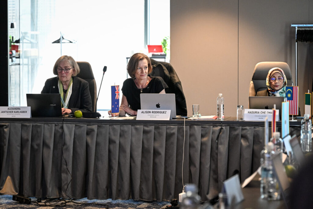 From left to right front: Vice-President Annette Schiller, Ireland; Secretary-General Alexandra Karlhuber-Jantscher, Austria; President Alison Rodriguez, New Zealand; Vice-President Alejandra Jorge, Argentina; Vice-President Eleanor Cornelius, South Africa;